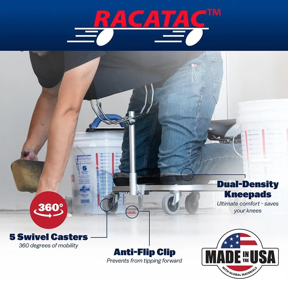 With the RACATAC™, you can save your back and knees on the jobsite. This ergonomically designed kneeling/sitting creeper allows you to roll while kneeling or sitting. Built-in, replaceable knee pads allow your knees to rest freely and provide the perfect balance between comfort and protection. The lightweight, durable frame will stand up to the demands of the job, while five swivel casters give 360-degrees of mobility. The handy tool tray keeps your tools and parts within reach, and the seat is adjustable. For jobs requiring you to kneel over, choose the RACATAC™ with chest support for reduced upper body fatigue. With the RACATAC™, you can work comfortably above wet, dirty, or dusty floors. The RACATAC™ is proudly Made in the USA with Global Materials.